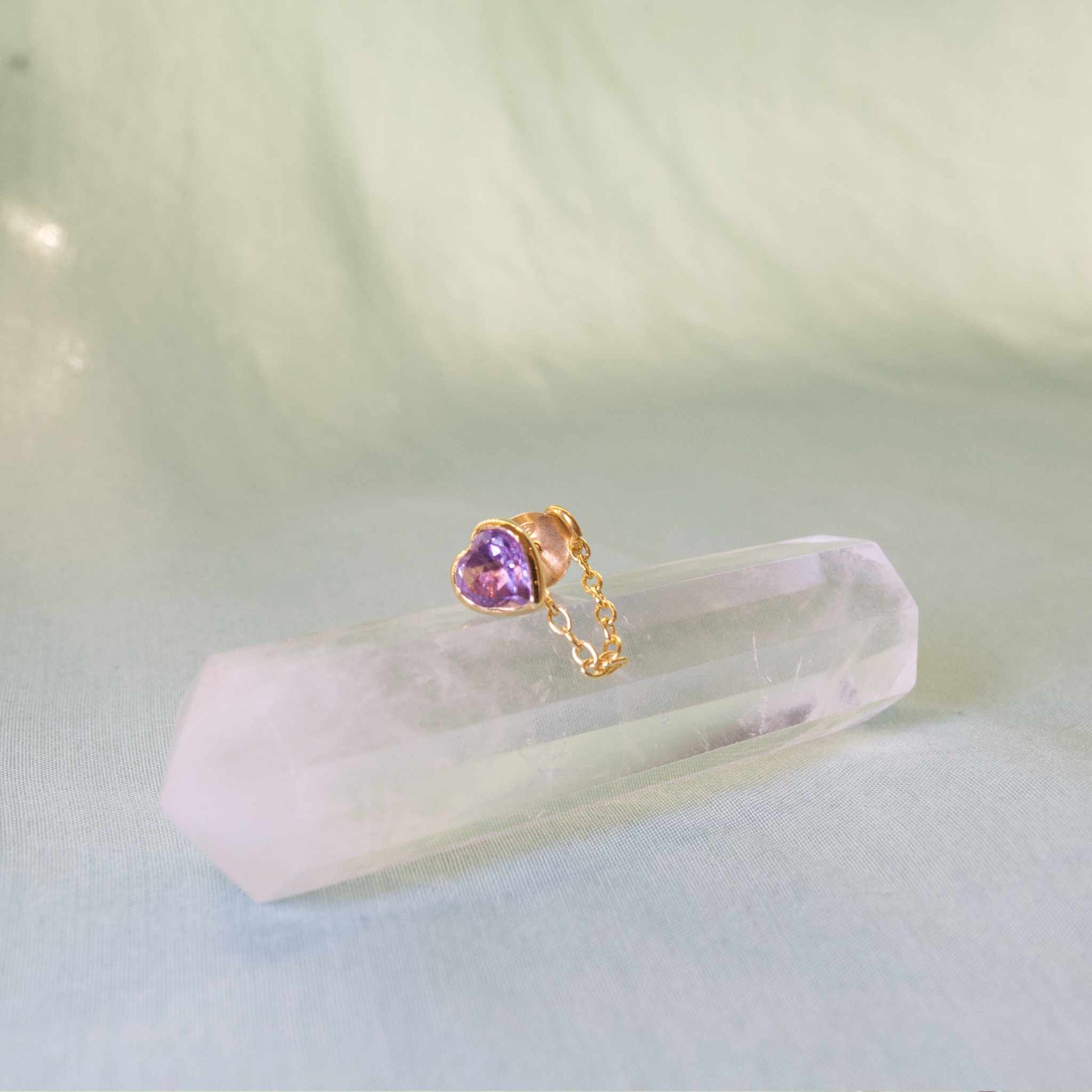 Ce petit Coeur en Améthyste violette taillée à la main , est lié de l'avant à l'arrière de l'oreille par une chaine accrochée au papillon à l'arrière de la boucle pour donner une petite touche Rock .
