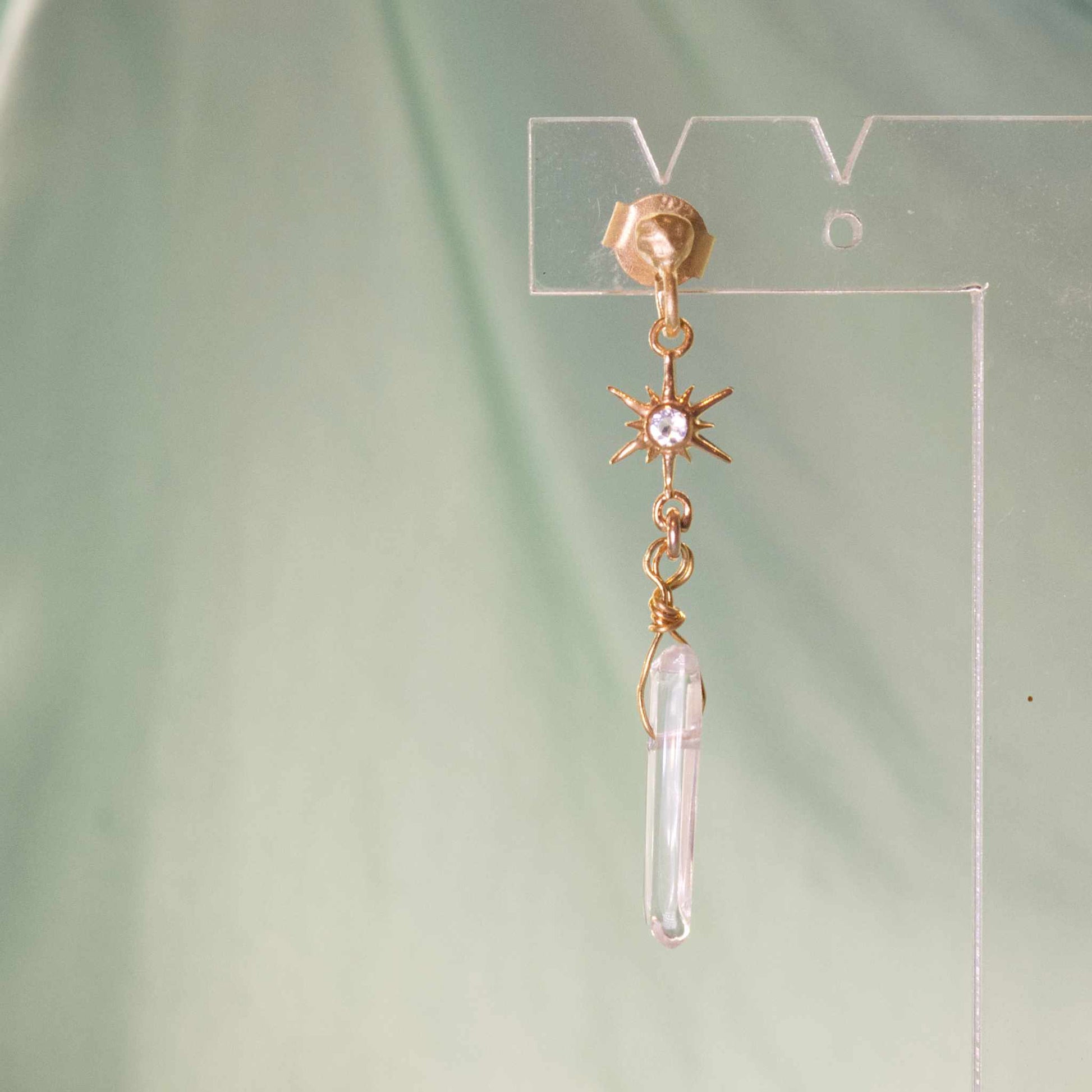 Vendue à l'unité cette boucle d'oreille est parfaite pour un premier ou deuxième trou . D'une grande finesse et tout en longueur, Un Cristal Quartz brut est suspendu au connecteur Soleil.